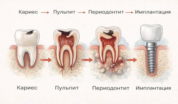 2. Нелеченный кариес, пульпит, кисты — инфекция перейдет на новый имплант.